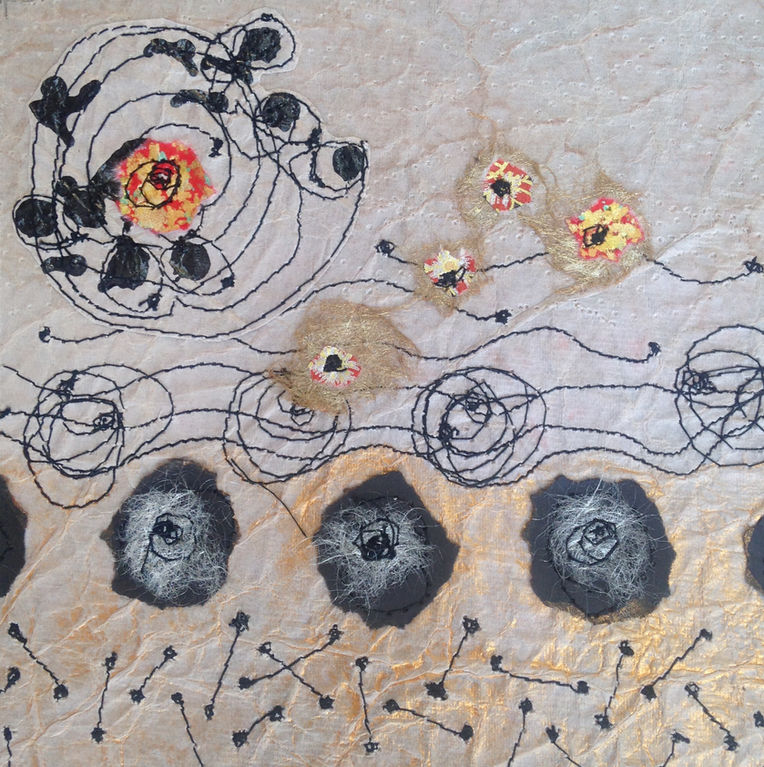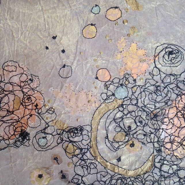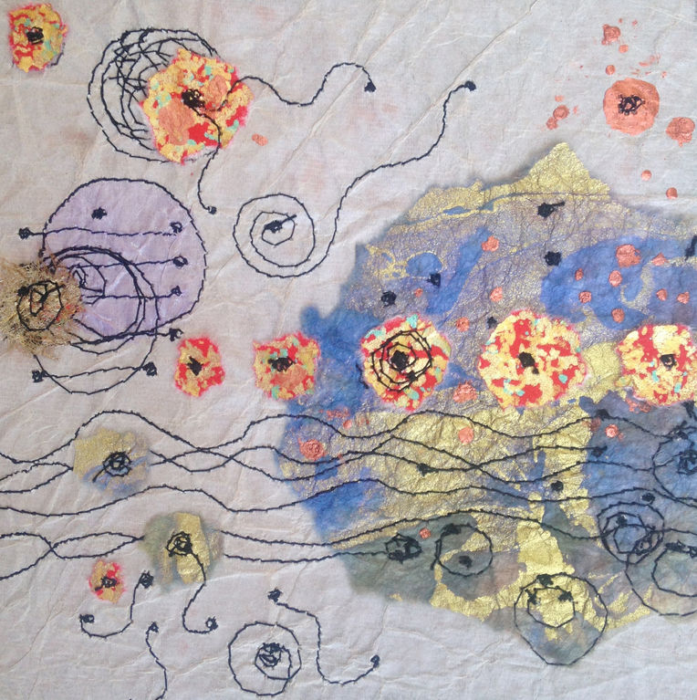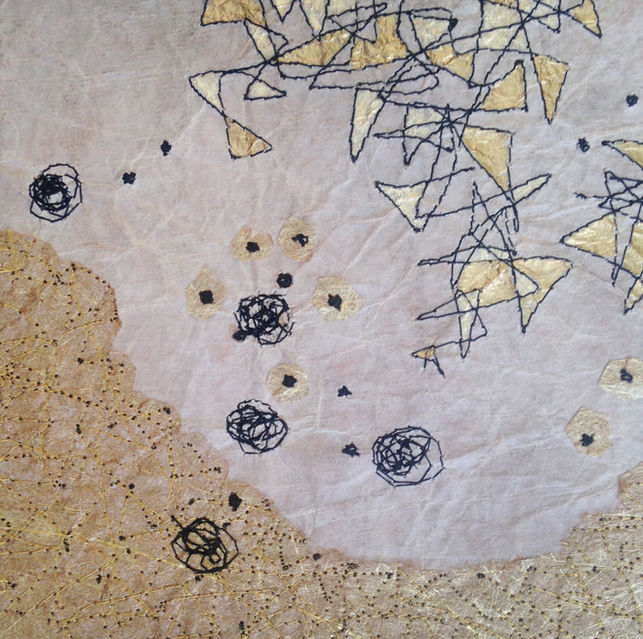 This project was juried by gallerist Jack Fisher for the 9th Annual Sanchez Art Center fundraiser. The challenge was to come up with a theme for fifty 6x6 inch works in fifty days. My daughter Ariel Marx (www.arielmarx.com) is a film composer and she offered segments of her film scores as inspiration for a new abstract sewing piece each day. My technique is to attach new and old detritus with a sewing machine to Lokta paper. My process was to listen to the music, inviting the title and the sound to create a mood which I followed in creating each piece.